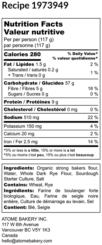 Ingredients: Organic Strong Baker Flour, Rye Stoneground Organic Flour, Water, Sourdough Starter Culture, Salt