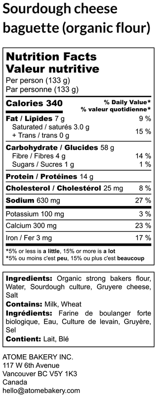 Ingredients: Organic strong baker white flour, Water, Gruyere cheese, Sourdough culture, Salt
